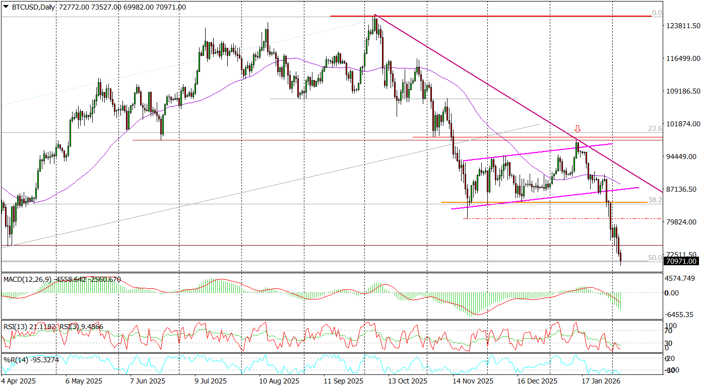 Trwający od października 2025 r. trend spadkowy na Bitcoin-ie przyspiesza, a sytuacja na wykresie dziennym sugeruje, że to jeszcze nie koniec spadków. Celem dla strony podażowej mogą być nawet rejony 48,7-57,6 tys. USD.