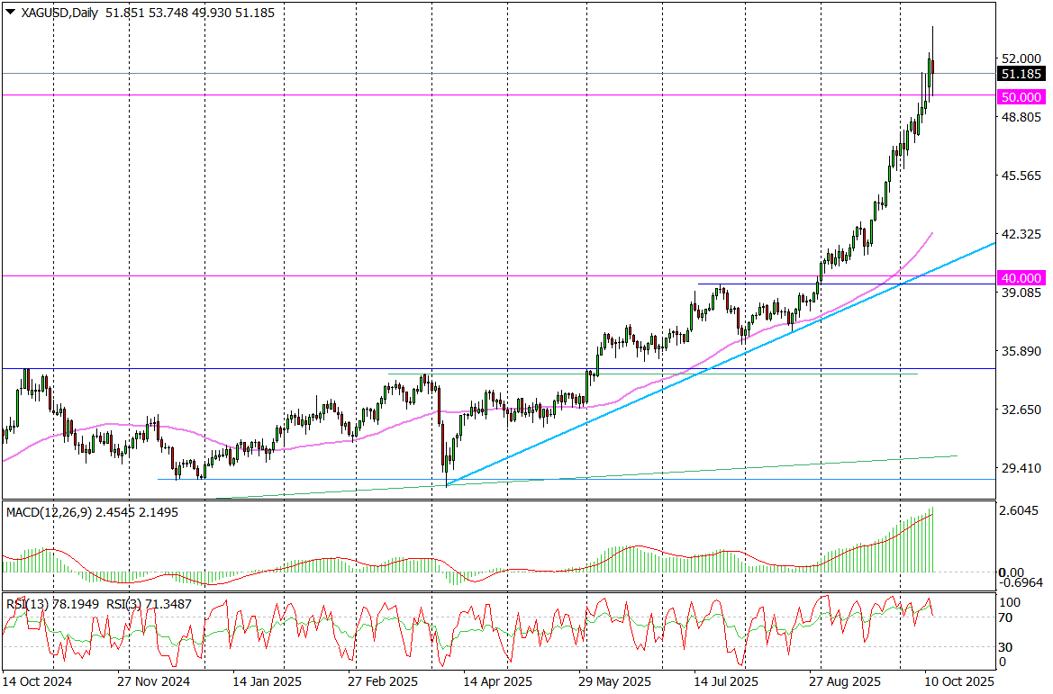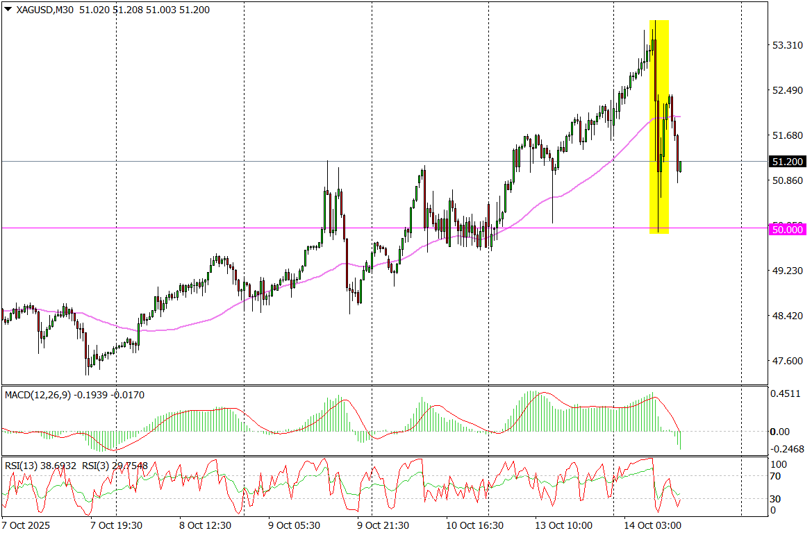Dziś mieliśmy namiastkę takiej realizacji zysków. Najpierw notowania srebra wystrzeliły na nowe rekordy na poziomie 53,748 USD, żeby niespełna godzinę później zaliczyć zjazd do 49,93 USD.