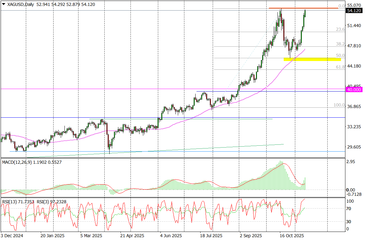 Aktualnie za srebro trzeba zapłacić 54,12 USD, czyli niewiele mniej niż rekordowe 54,453 USD w październiku i dużo więcej niż w dołku październikowej korekty, gdy cena srebra spadła do 45,546 USD.
