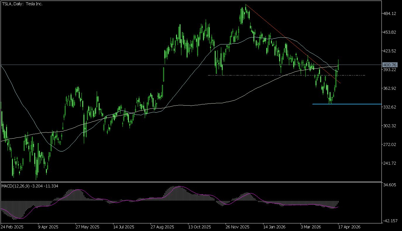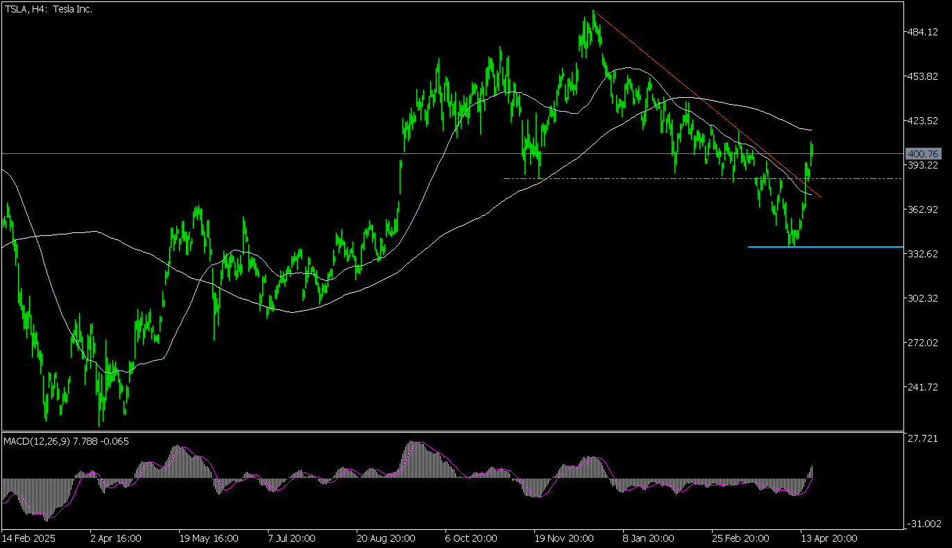 Wykres TSLA w kompresji 4-godz. wykonał zwrot w górę z okolic 337,25 USD, następnie przełamując 50-okresową średnią, 4-miesięczną linię bessy, wybijając się powyżej 38,2 proc. zniesienia trwających od grudnia spadków oraz wracając powyżej lokalnych dołków z ostatnich miesięcy. Na gruncie analizy technicznej oznacza to zakończenie trwającej od grudnia tendencji spadkowej i powrót do wzrostów.