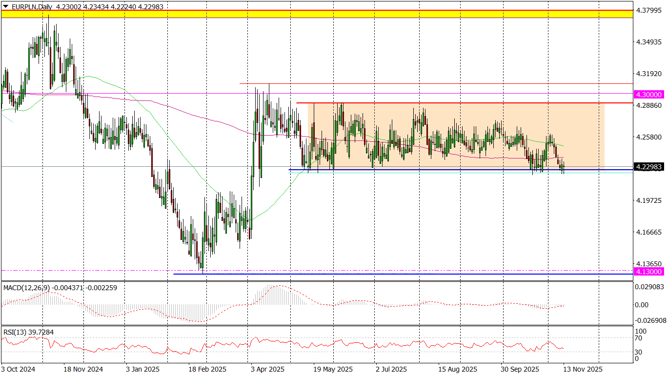 Złoty nie zareagował na opublikowane dziś dane. Polska waluta cały czas pozostaje mocno. Kurs EUR/PLN od kilku miesięcy porusza się w wąskim przedziale wahań 4,23-4,29 zł.