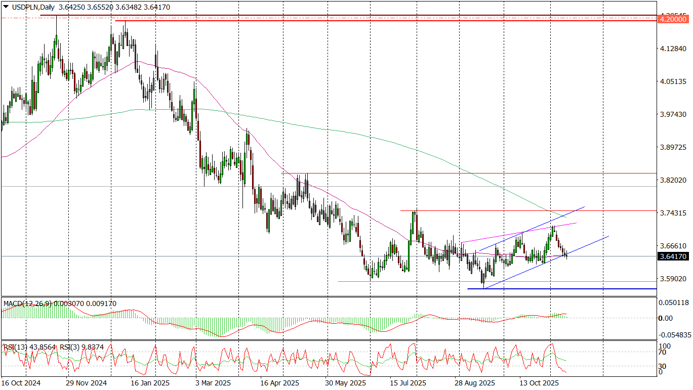Kurs USD/PLN, którego zachowanie jest wypadkową notowań EUR/PLN i EUR/USD, od połowy września korygował swoje spadki. Nie jest wykluczone, że właśnie ta wzrostowa korekta się zakończyła. Tak się stanie, jeżeli wykres dzienny USD/PLN wybije się dołem z dwumiesięcznego kanału wzrostowego, czyli spadnie wyraźnie poniżej 3,64 zł.