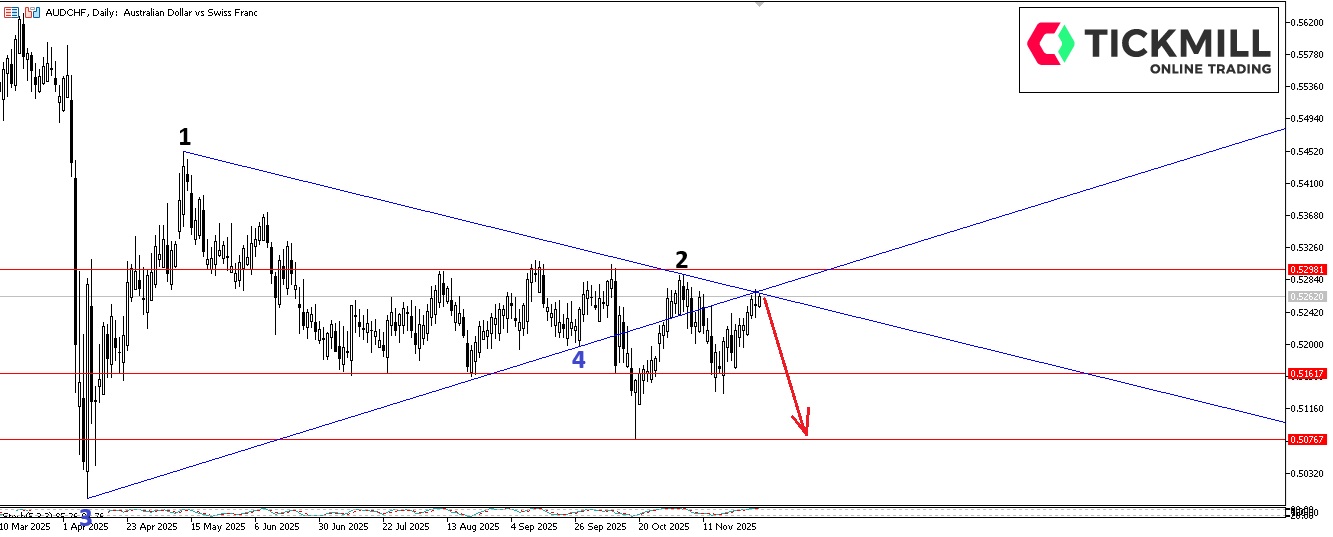 Кросс-курс AUD/CHF протестировал ключевое пересечение нисходящей линии тренда (построенной по точкам 1 и 2) и пробитой линии восходящего тренда (точки 3 и 4), закрыв пятницу свечной моделью "длинноногий доджи".