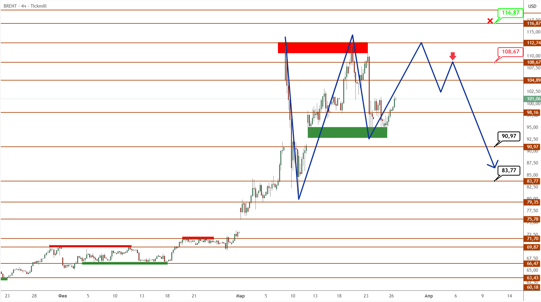 В дальнейшем, цена продолжила колебаться в районе от 108 до 95, каждый раз реагируя на разнонаправленные новости каждой из сторон, консолидируясь в ожидании деэскалации. Трамп в Truth Social объявил о «продуктивных переговорах» с Ираном и пятидневной паузе в ударах по иранской энергетической инфраструктуре.