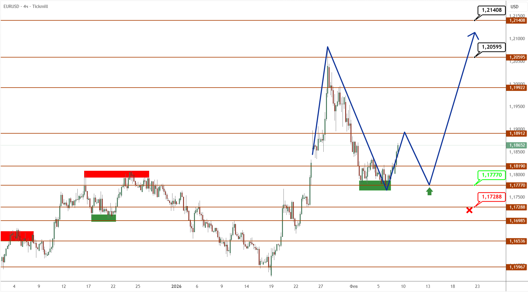 Это сигнализирует об окончании коррекционного снижения и возобновлении восходящего вектора. Цене необходимо удержаться над уровнем 1,1770, где она уже обнаружила заметную поддержку. Так что в случае развития локальной коррекции этот уровень выступает ключевой рубежом, который может отметиться высоким покупательским интересом. Ретест этого уровня с последующим отскоком даст возможность развить очередной восходящий импульс, который нацелится в область между 1,2059-1,2140.