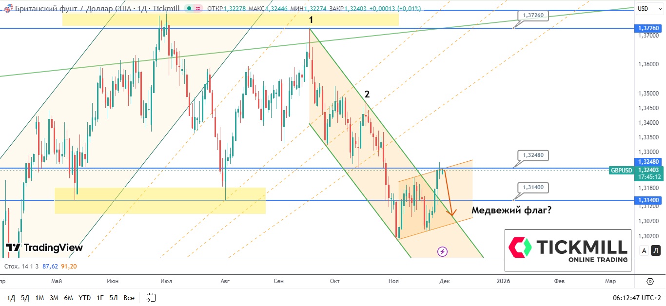 Пара GBP/USD остановилась в точке пересечения уровня сопротивления $1.3248$ и верхней линии потенциального медвежьего флага. На торгах в четверг была сформирована свечная модель "доджи", что может усилить медвежьи настроения по фунту стерлингов.