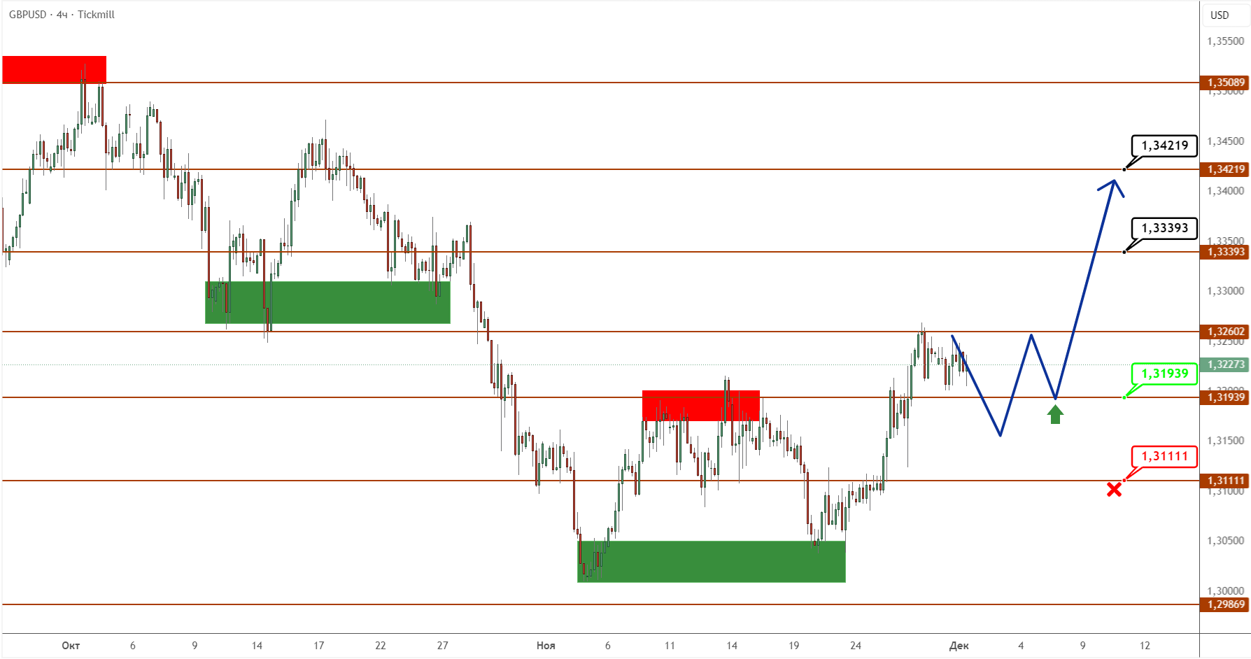 Это однозначно указывает на сохраняющийся потенциал продолжения восходящего вектора. Цена удерживается под уровнем 1,3193, который формирует границу ключевой зоны поддержки с ощутимым интересом со стороны покупателей, стабильно подталкивающих рынок вверх и блокирующих попытки углубить коррекцию. Поэтому очередной ретест этой области и последующий отскок от нее откроют дорогу следующему восходящему импульсу, который нацелится в диапазон 1,3339–1,3421.