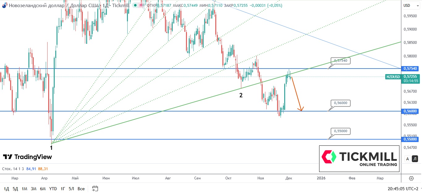 Новозеландский доллар протестировал пробитую линию восходящего тренда (часть более крупного разворотного веера), при этом торги в понедельник закрылись свечой "падающая звезда", сформированной, однако, белым телом. Также котировки протестировали уровень 0.5754.