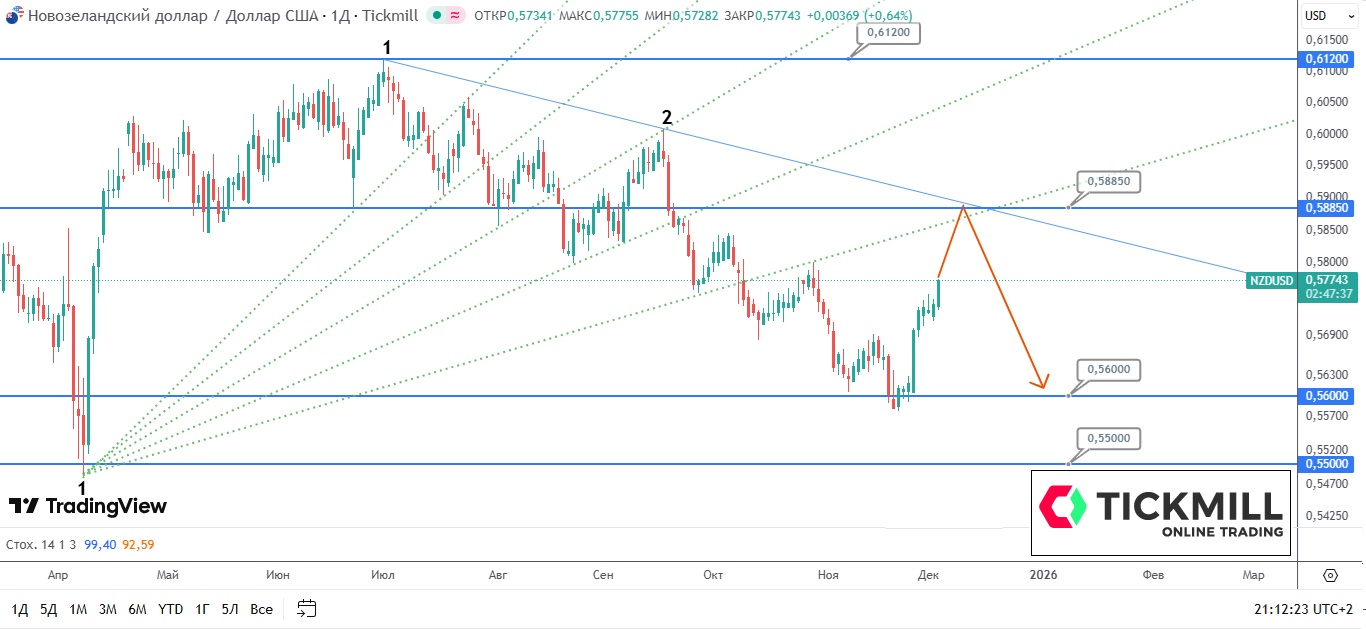 На фоне этого движения покупатели могут подтянуть новозеландский доллар вплоть до нисходящего тренда (построенного по точкам 1 и 2) и пробитого восходящего тренда, в районе уровня $0.5885$, что обозначит более глубокую коррекцию. Именно в точке пересечения указанных технических линий может быть слом текущей ситуации и разворот котировок к снижению.