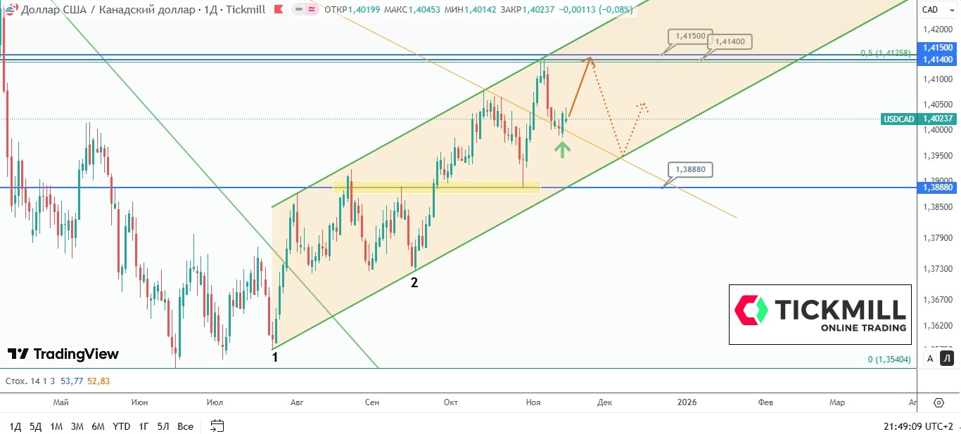 Котировки пары USD/CAD остановились на ранее пробитой локальной линии тренда, построенной по максимумам 03.02.2025 и 21.10.2025. Закрытие четверга паттерном поглощения обозначило намерения "быков" развить восходящий импульс с текущих уровней, не дожидаясь теста линии восходящего канала (построенного по точкам 1 и 2). Для покупателей риск оправдан.