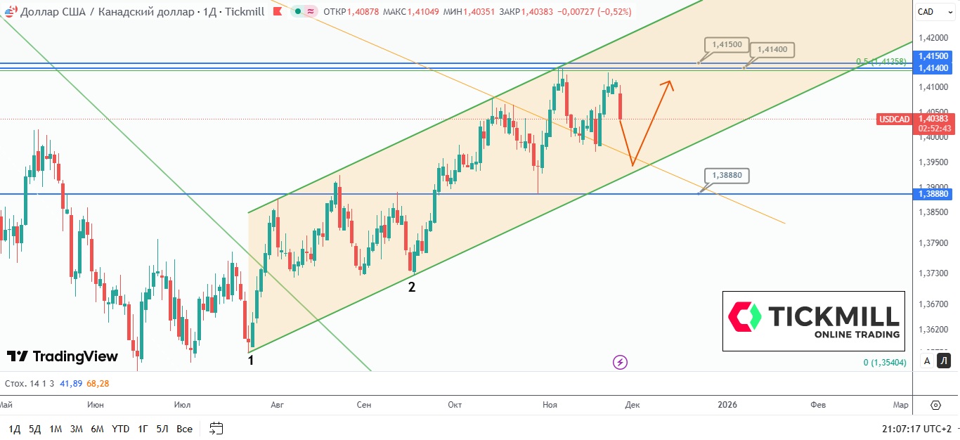 Канадец (имеется в виду пара USD/CAD) перешел в фазу коррекции и движется в сторону точки пересечения линии восходящего канала (точки 1 и 2), а также ранее протестированного пробитого даунтренда, построенного по максимумам 03.02.2025 и 21.10.2025.