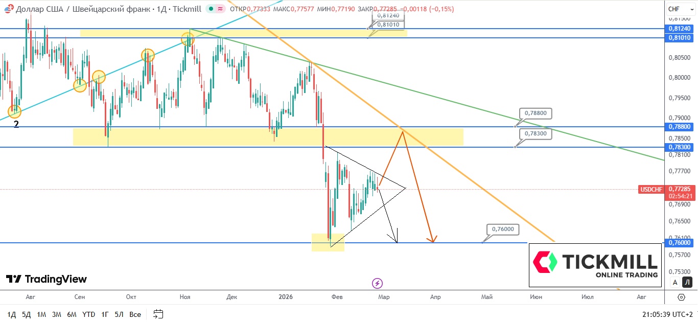 Наиболее вероятным сценарием остается работа от зеркальной зоны сопротивления 0.7830–0.7880. Здесь техническая картина усиливается нисходящей линией недельного тренда (построенной по максимумам 03.02.2025 и 16.01.2026). При реализации «южного» сценария котировки устремятся к первой значимой поддержке на уровне 0.7600, которая под натиском продавцов рискует в конечном итоге не устоять.