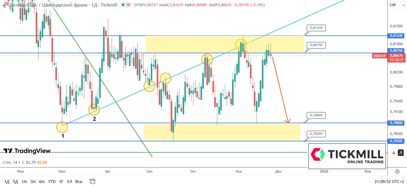 Швейцарский франк протестировал верхнюю область дневного диапазона, оформленную между уровнями 0.8075 и 0.8124, и текущий день (вторник) готовится закрыть свечной формацией «падающая звезда». Потенциал нисходящего движения цен продолжает усиливаться.