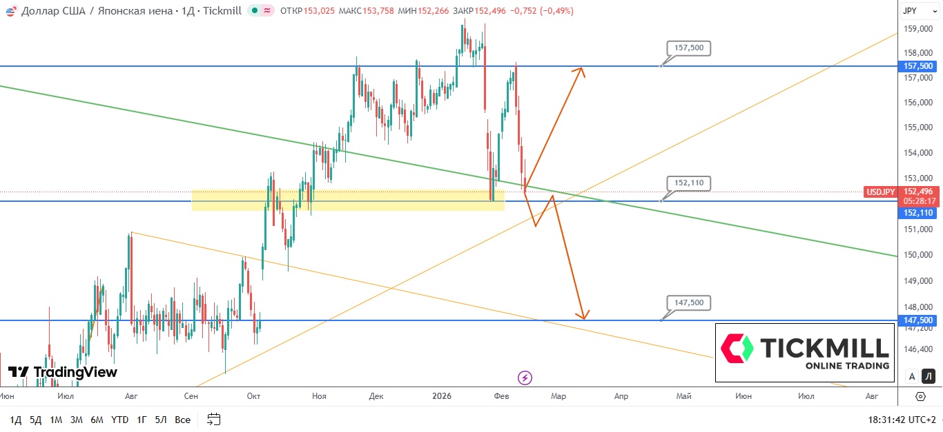Валютная пара подходит к важной точке пересечения нескольких технических линий: пробитого недельного пологого даунтренда (построенного по максимумам 10.07.2024 и 10.01.2025), уровня поддержки 152.11 и расположенной чуть ниже линии восходящего тренда (построенной по минимумам 22.04.2025 и 17.09.2025).